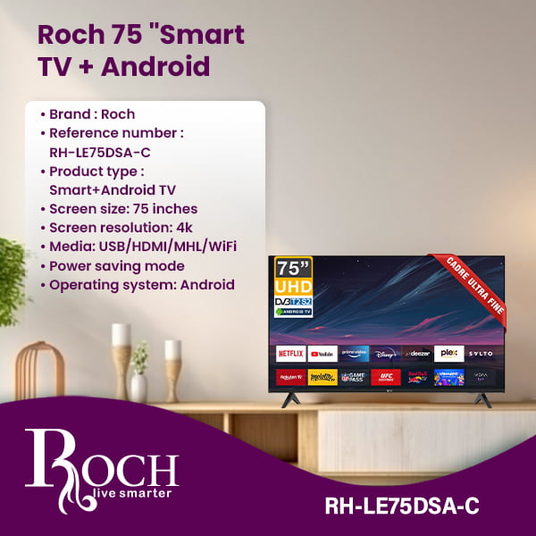 Discover the Roch 75″ Smart + Android TV, designed to offer an unrivaled entertainment experience in your living space. From the Roch brand, recognized for its quality electronic products, this television combines cutting-edge technology and user-friendly features for visual immersion ... unprecedented. With a gigantic 75-inch screen and stunning 4K resolution, this Smart + Android TV delivers breathtaking visuals with exceptional clarity and detail Whether you’re watching movies, sports, or your favorite TV shows, every scene comes to life with vibrant colors and sharp images. Connectivity options are plentiful with USB, HDMI, MHL and WiFi capabilities, allowing you to easily connect external devices such as game consoles, Blu-ray players and streaming devices Plus, with the power saving mode feature, you can enjoy your entertainment while minimizing energy consumption and reducing your environmental impact. Powered by the versatile Android operating system, this TV offers a smooth and intuitive user interface, providing access to a wide range of apps, games and streaming services. Whether you’re surfing the web, checking social media, or exploring new content, navigating through the features is easy and enjoyable. Backed by a reliable 2-year warranty, you can invest in the TV with confidence Roch 75″ Smart + Android, knowing that your purchase is protected against any unforeseen problems. Its sleek design, advanced features and energy-efficient operation make it the perfect focal point for any home theater or living room. Enhance your entertainment experience with the Roch 75″ Smart + Android TV and immerse yourself in a world of endless possibilities. Whether you’re hosting movie nights, gaming marathons, or relaxing with family, this TV promises an immersive viewing experience that will captivate and delight.Read more