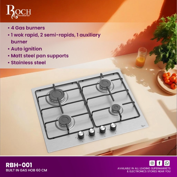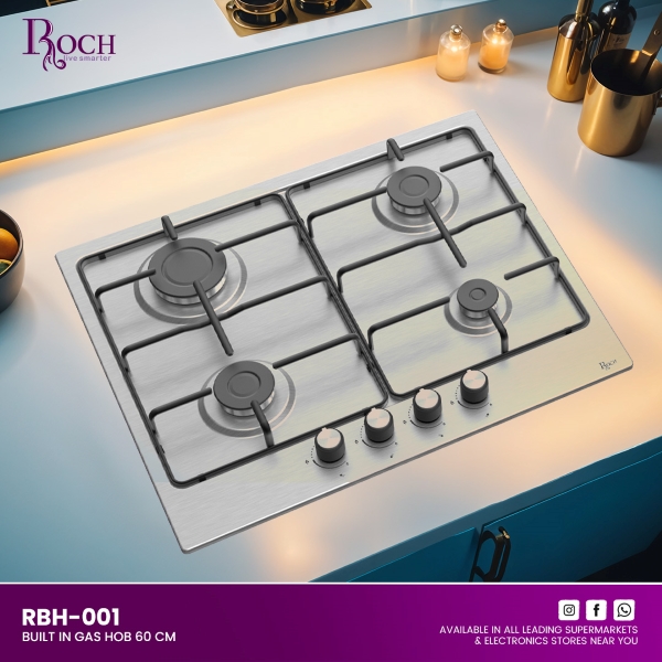 Upgrade your kitchen with the ROCH Built-In Gas Hobs 60cm (RBH-001), designed for efficiency and style. This sleek hob features four gas burners that cater to various cooking needs, including 1 rapid burner for quick heating, 2 semi-rapid burners, and ... 1 auxiliary burner for precise simmering. Experience hassle-free cooking with its auto ignition feature, ensuring convenient startup every time you cook. The matte steel pan supports provide a stable base for your cookware, enhancing safety and stability while cooking. Crafted from durable stainless steel, this built-in hob not only complements modern kitchen aesthetics but also ensures long-lasting performance. Whether you’re whipping up a quick weekday meal or indulging in gourmet cooking sessions, the ROCH Built-In Gas Hobs 60cm (RBH-001) delivers reliable performance and effortless functionality. Elevate your culinary experience with ROCH’s commitment to quality and innovation, making cooking a pleasure with every dish. Discover the perfect blend of functionality and elegance for your kitchen, making the ROCH Built-In Gas Hobs 60cm (RBH-001) an essential addition to any home chef’s kitchen arsenal. Transform your cooking space today with ROCH, where quality meets design excellence in every appliance.Read more