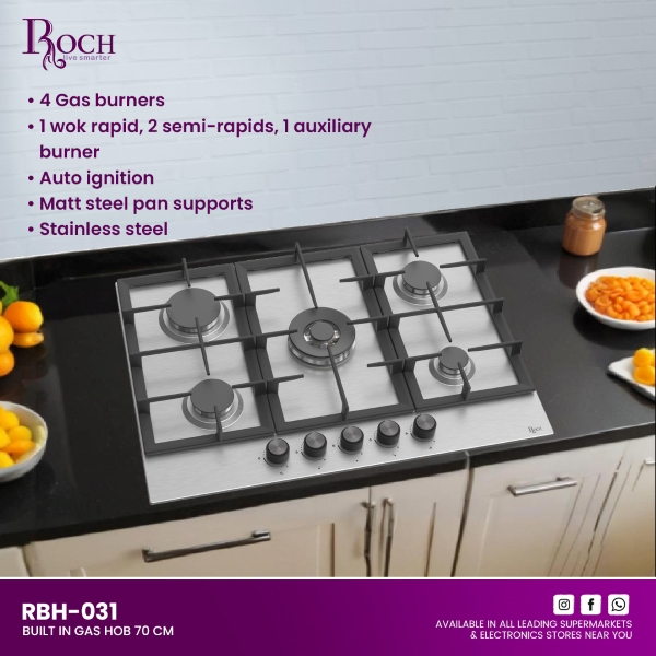 Upgrade your kitchen with the ROCH Built-In Gas Hobs, featuring the RBH-031 model designed for modern cooking convenience. With five versatile gas burners, including 1 wok burner, 1 rapid burner, 2 semi-rapid burners, and 1 auxiliary burner, you have the ... flexibility to prepare multiple dishes simultaneously. Enjoy hassle-free cooking with auto ignition, ensuring quick and efficient start-up every time. The robust cast iron pan supports provide stability for your pots and pans, while the sleek stainless steel finish adds a touch of elegance to your kitchen décor. Whether you’re a seasoned chef or a cooking enthusiast, the ROCH RBH-031 Built-In Gas Hobs offer durability, functionality, and style in one compact unit. Perfect for family meals, dinner parties, or everyday cooking needs, these gas hobs are designed to enhance your culinary experience with ease. Elevate your cooking space with ROCH’s commitment to quality and innovation. Discover the joy of efficient cooking and timeless design with the ROCH Built-In Gas Hobs.Read more