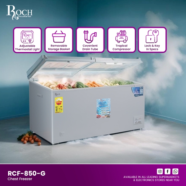 Discover the perfect blend of functionality and convenience with the ROCH Chest Freezer (Model RCF-850-G). Designed to meet your storage needs, this freezer offers a spacious interior, making it ideal for families and businesses alike. The RCF-850-G features an adjustable thermostat, ... allowing you to set the perfect temperature for your food storage. It also includes a light inside, ensuring you can easily find what you need, even in low light conditions. The removable storage basket helps keep smaller items organized and easily accessible. For added convenience, this freezer comes with a drain tube, simplifying the process of defrosting and cleaning. Its tropical compressor is designed for energy efficiency, helping you save on electricity bills while keeping your food fresh. The optional VCM panel adds a sleek touch to its appearance, enhancing its fit in any space. Security is a priority with the built-in lock and key, ensuring that your stored items remain safe. Whether you’re stocking up on groceries or storing bulk items, the ROCH Chest Freezer RCF-850-G combines practicality with advanced features to meet all your freezing needs.Read more