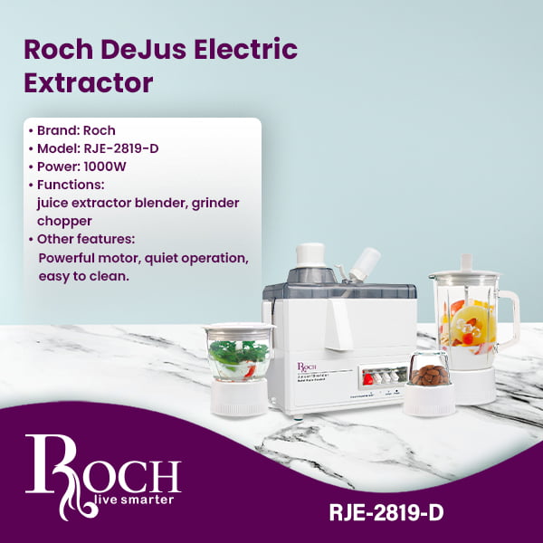 Discover the ultimate kitchen companion with the Roch Electric Juice Extractor. Designed by trusted brand Roch, the RJE-2819-D model offers a powerful and versatile solution for all your juicing, blending, crushing and chopping needs. With an impressive 1000W of power, This ...Read more