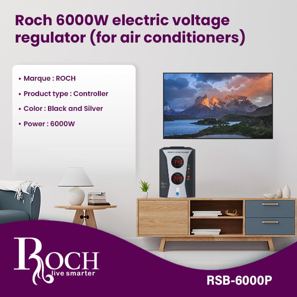 The Roch 6000W electrical voltage regulator (for air conditioner) ensures optimal operation of your air conditioner by regulating the electrical voltage. Manufactured by Roch, this regulator is designed to provide reliable protection and exceptional performance for your air conditioning unit. With ... a power of 6000W, this regulator is equipped with a microprocessor-controlled stabilizer to ensure voltage stable and reliable. With its digital display, you can easily monitor the output voltage in real time, allowing you to stay informed about the status of your electrical system. The Roch electrical voltage regulator also offers a quick response function , which automatically adjusts the voltage in case of sudden fluctuations, ensuring your air conditioner is protected from damage caused by voltage surges or brownouts. With protection features such as overload protection, short circuits and reverse voltages, this regulator guarantees the safety of your air conditioner in all circumstances. Plus, it features a built-in USB charging port, allowing you to easily charge your electronic devices while protecting your air conditioner. The sleek black and silver design blends seamlessly into any environment domestic or professional. Compact and easy to install, this regulator is a practical and effective addition to ensure the proper functioning of your air conditioner. Opt for the Roch 6000W electric voltage regulator for reliable protection and optimal performance of your air conditioner. Guarantee the longevity and safety of your air conditioning unit with this high quality regulator from Roch.Read more
