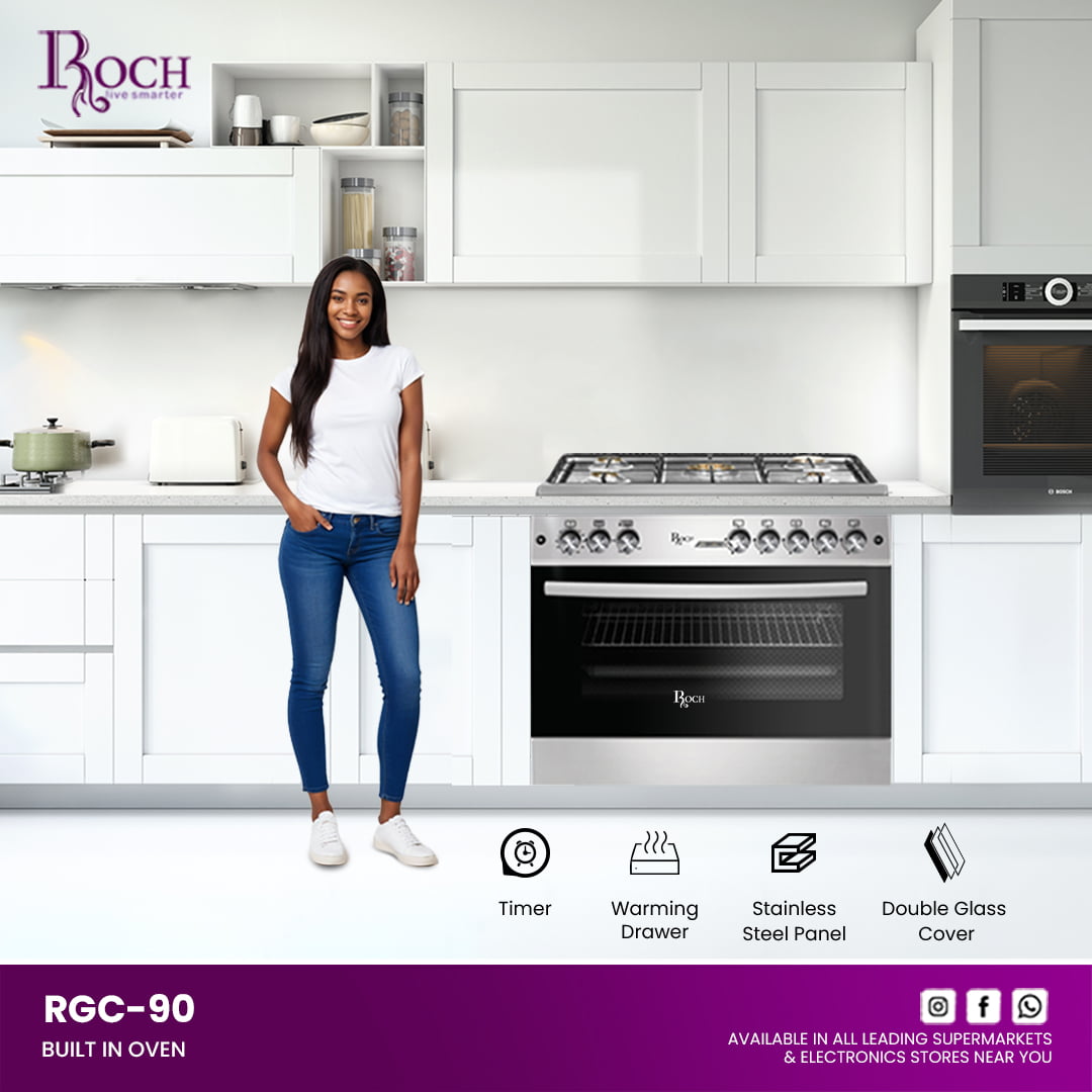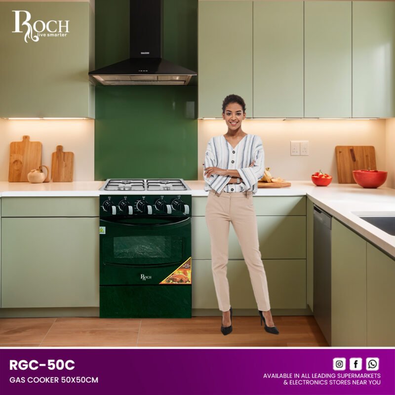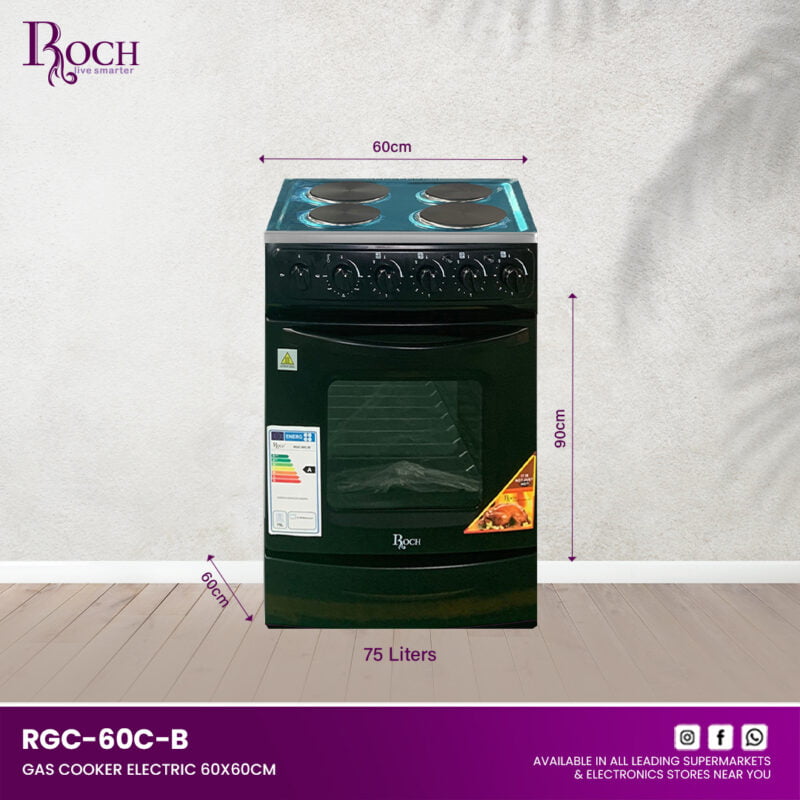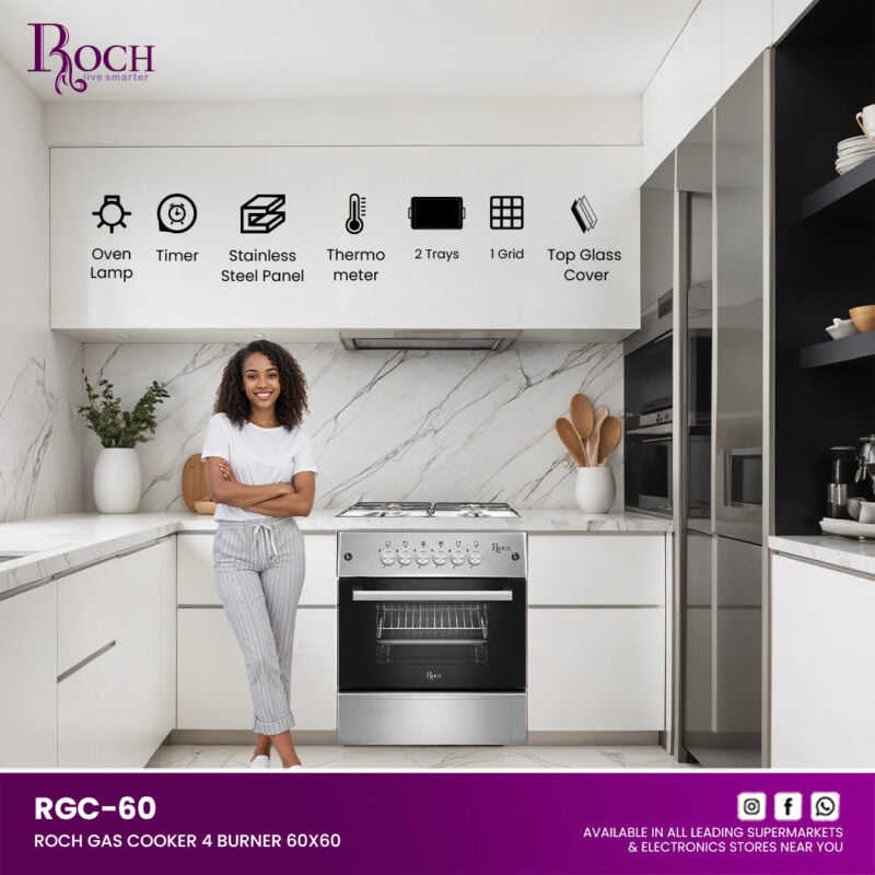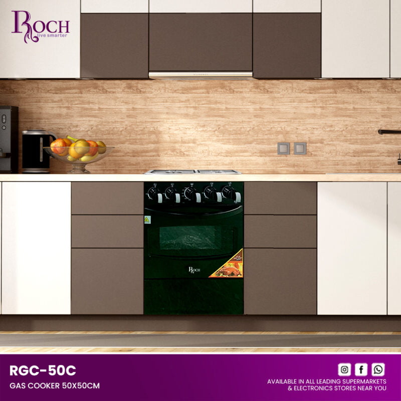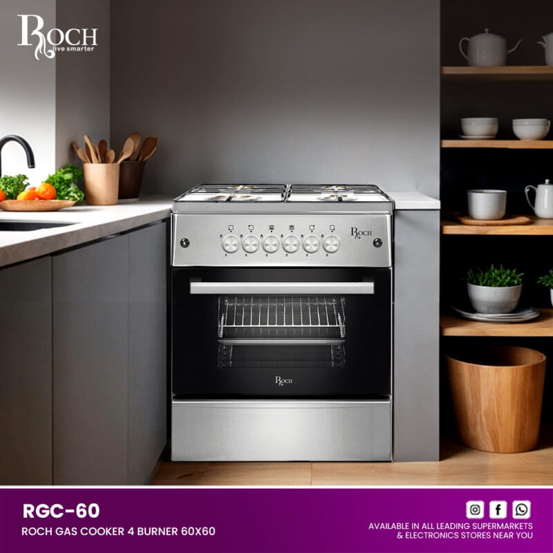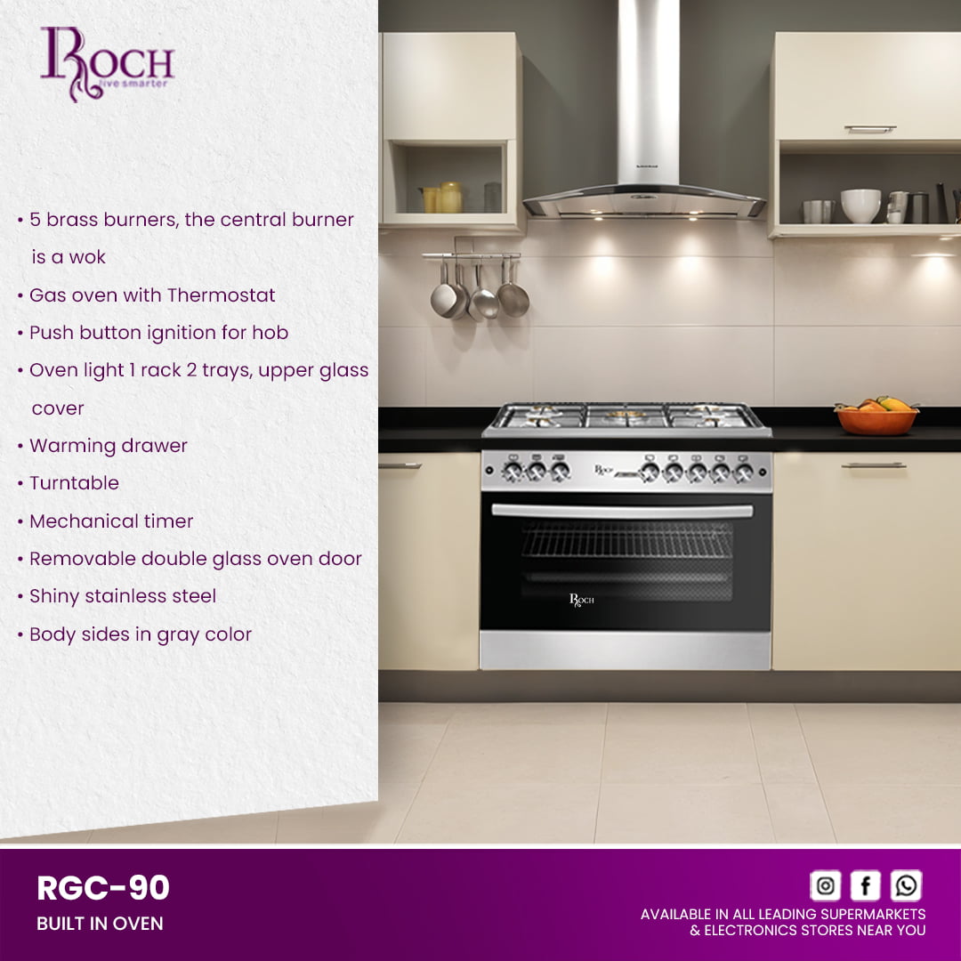 Experience culinary excellence with the ROCH Gas Cooker 5 Burners 90×60, featuring the innovative RGC-90 model designed to meet all your cooking needs. Whether you’re preparing everyday meals or hosting a feast, this cooker delivers unparalleled performance and style to ... your kitchen. Equipped with 5 durable brass burners, including a central wok burner, the cooker ensures even heat distribution for precise cooking results. The gas oven includes a thermostat for accurate temperature control, perfect for baking, roasting, and more. Convenient push-button ignition for the hob makes starting the burners effortless. Illuminate your cooking with the oven light and utilize the spacious interior with 1 rack and 2 trays, complemented by an upper glass cover for added convenience. Keep dishes warm in the warming drawer and easily monitor cooking times with the mechanical timer. The removable double glass oven door facilitates cleaning and maintenance. Crafted from shiny stainless steel with stylish gray-colored body sides, the ROCH Gas Cooker blends modern aesthetics with durability. Upgrade your kitchen with this versatile appliance that combines functionality, efficiency, and elegant design.Read more