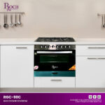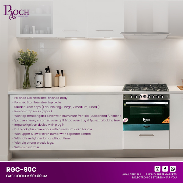Experience the perfect blend of style and functionality with the ROCH Gas Cooker (Model RGC-90C). Crafted with a polished stainless steel body and top plate, this cooker not only enhances your kitchen’s aesthetics but also ensures long-lasting durability. The cooker features ... a versatile Sabaf burner copy with five burners: one double ring, one large, two medium, and one small, accommodating all your cooking needs. The iron cast top racks, with three pieces, provide robust support for your cookware. The top temper glass cover with an aluminum front lid adds a touch of elegance and practicality with its suspended function. Inside, the oven boasts a full black glass door with an aluminum handle, giving it a sleek appearance. The heavy chromed oven grill, along with two baking trays, makes it easy to prepare multiple dishes simultaneously. The impulse ignition device ensures quick and safe ignition every time. With separate controls for the upper and lower oven burners, you have precise control over your cooking. The built-in rotisserie and inner lamp add to the oven’s versatility, allowing you to cook a variety of dishes to perfection. The dish warmer feature keeps your meals warm until ready to serve. Measuring 900x600x840mm in body size and weighing 65kg, the ROCH Gas Cooker is designed for efficiency and convenience. Its big, strong plastic legs provide stability and ease of movement. Upgrade your cooking experience with the ROCH Gas Cooker – where quality meets elegance.Read more