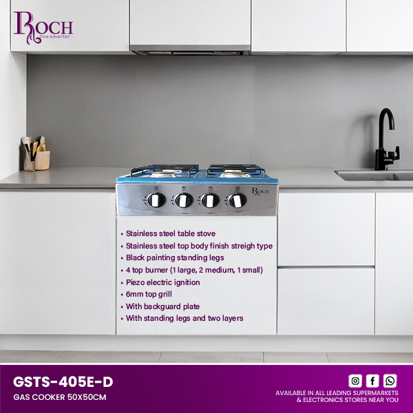 Upgrade your kitchen with the ROCH Gas Cooker, a perfect blend of functionality and modern design. Crafted with a durable stainless steel table stove and a sleek stainless steel top body finish, this cooker adds a touch of elegance to ... your culinary space. The black painting standing legs not only provide sturdy support but also complement any kitchen decor effortlessly. Equipped with four burners (including one large, two medium, and one small burner), the ROCH Gas Cooker ensures versatile cooking options to meet your culinary needs. The Piezo electric ignition system guarantees quick and reliable ignition, making cooking a hassle-free experience. Designed for convenience, it features a 6mm thick top grill, a backguard plate for added safety, and comes with standing legs for stability. The cooker weighs 9.2kg and has rubber legs at the bottom to prevent slipping, ensuring safety during use. With dimensions of 495545780mm and a compact packing size of 500575200mm, it fits seamlessly into any kitchen space. Bring efficiency and style to your cooking with the ROCH Gas Cooker, designed to elevate your culinary experience with its reliable performance and sleek aesthetics.Read more