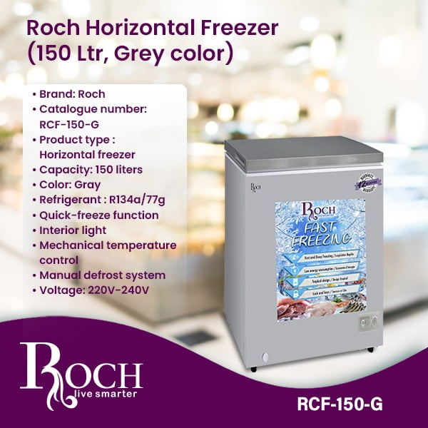 Discover the Roch Horizontal Freezer in an elegant gray color, designed to offer practical and efficient freezing solutions for your home. With a capacity of 150 liters, this freezer provides ample space to store a variety of frozen products, from ... meats and vegetables to ice cream and desserts. The Roch RCF-150-G model is equipped with a freeze function fast, allowing you to quickly freeze freshly added items and lock in their freshness and flavor. Interior light illuminates the freezer compartment, making it easy to locate and access your stored items, even in low light conditions. Featuring mechanical temperature control, this chest freezer allows you to adjust the temperature according to your preferences, ensuring optimal storage conditions for your frozen foods. The manual defrost system allows for easy maintenance, keeping your freezer clean and operating efficiently. With a voltage range of 220V-240V, the Roch Horizontal Freezer is suitable for most homes, providing reliable performance day in and day out . Additionally, the freezer is eco-friendly, using R134a refrigerant, ensuring minimal impact on the environment. Backed by a 12-month warranty, you can trust the quality and durability of the Roch Horizontal Freezer. Whether you need extra freezer space for your kitchen, garage, or office pantry, this freezer is the perfect solution for storing your food and keeping it fresh for longer periods of time. Enhance your freezing capacities with the Roch Horizontal Freezer (150 L, Gray Color) and benefit from practical storage and easy access to your frozen products. With its user-friendly features and reliable performance, this freezer will surely meet your freezing needs with ease and efficiency.Read more