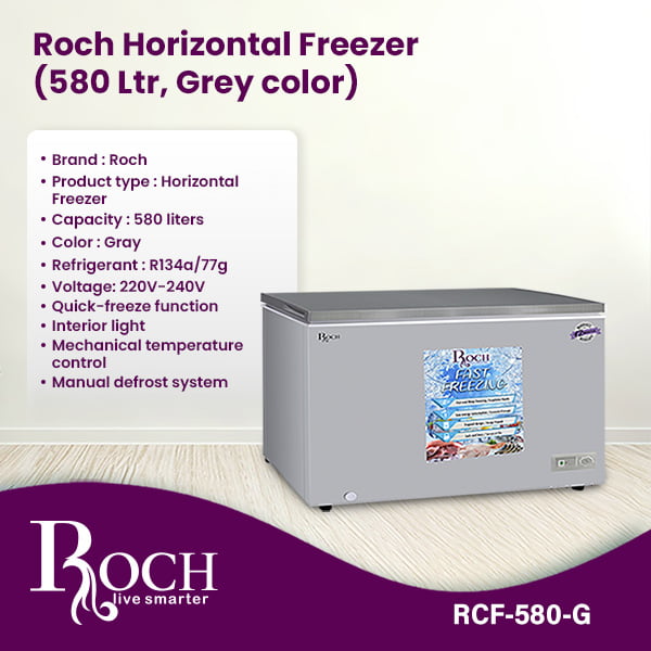 Discover the ultimate freezing solution with the Roch Horizontal Freezer in an elegant gray color. With an impressive capacity of 580 liters, this freezer provides ample storage space for all your frozen goods, whether for your home kitchen, grocery store ... or commercial kitchen. The Roch RCF-580-G model is equipped with a quick freeze function, allowing you to quickly freeze your groceries or freshly prepared foods, preserving their taste, texture and nutritional value. The interior light illuminates the freezer compartment, making it easy to find and access your items, even in low light conditions. Featuring a mechanical temperature control, this chest freezer allows you to adjust the temperature settings to suit your needs, ensuring your frozen foods are stored at the ideal temperature. The manual defrost system simplifies maintenance, allowing you to easily remove any frost build-up and keep your freezer clean and efficient. With a voltage range of 220V-240V, the Roch Horizontal Freezer is suitable for most homes and commercial environments, delivering reliable performance day in and day out. Additionally, the freezer uses an environmentally friendly R134a refrigerant, minimizing its impact on the environment. Backed by a 12-month warranty, you can have confidence in the quality and durability of the Roch Horizontal Freezer. Whether you need additional freezer space for bulk storage or to keep your business stocked with frozen goods, this freezer is the ideal solution. Enhance your freezing capabilities with the Roch Horizontal Freezer (580 L, Gray Color) and enjoy convenient storage and easy access to your frozen foods. With its user-friendly features and reliable performance, this freezer is sure to meet your freezing needs with ease and efficiency.Read more