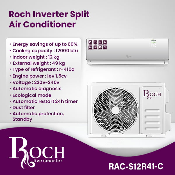 Experience optimal cooling efficiency with the Roch Inverter Split Air Conditioner, a reliable choice designed to enhance your indoor comfort while saving energy. This air conditioner boasts impressive energy savings of up to 60%, making it not only cost-effective but ... also environmentally friendly. With a cooling capacity of 12000 BTU, the Roch Inverter Split Air Conditioner delivers powerful performance to cool your space efficiently. It weighs 12 kg indoors and 49 kg outdoors, ensuring durability and easy installation. Utilizing R-410A refrigerant, known for its eco-friendly properties, this air conditioner operates on a 1.5CV engine and is compatible with 220V-240V voltage. Its automatic diagnosis feature quickly identifies any operational issues, ensuring seamless performance. Enhancing user convenience, the Ecological Mode optimizes energy consumption, while the 24-hour timer with automatic restart allows you to schedule cooling cycles according to your needs. A built-in dust filter improves air quality by capturing dust particles, promoting a healthier indoor environment for you and your family. Upgrade your cooling experience with the Roch Inverter Split Air Conditioner, combining advanced technology with user-friendly features to provide efficient and sustainable cooling solutions. Enjoy quiet operation, energy efficiency, and superior comfort throughout the year.Read more