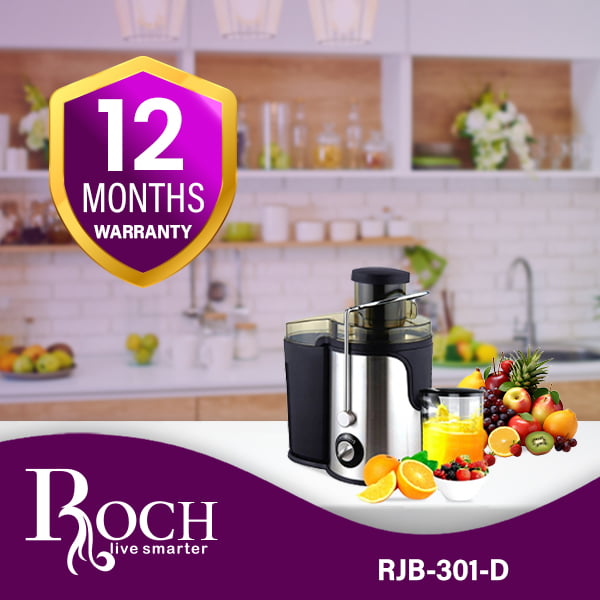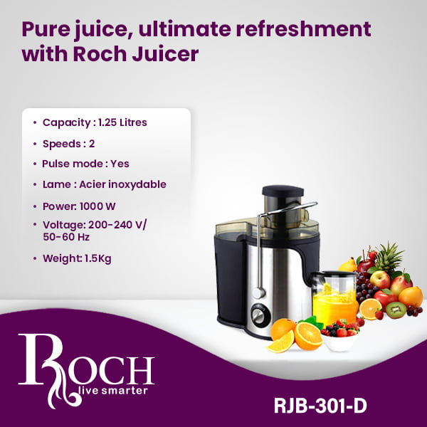 Discover the Roch juice extractor, a versatile blender designed to make juicing and blending easy. From the trusted Roch brand comes the RJB-301-D, equipped with features ensuring comfort and performance in your kitchen. With a generous 1.25 liter capacity, this juice ... extractor allows you to prepare large quantities of your favorite juices and smoothies to enjoy throughout the day. Whether you’re craving a refreshing fruit juice or a nutrient-rich green smoothie, the Roch Juice Extractor has you covered. Featuring two speed settings, you can adjust the blending speed according to your ingredients for optimal results. Plus, with a pulse mode, you have full control over the mixing process, allowing you to achieve the desired consistency effortlessly. The stainless steel blade guarantees durability and precision, effortlessly pulverizing fruit, vegetables and other ingredients to extract the maximum nutrients and flavors. Say goodbye to thick chunks and hello to silky drinks every time. Powered by a sturdy 400W motor and operating at a voltage of 200-240V/50-60Hz, this juice extractor delivers consistent performance, ensuring a effective mixing with each use. Despite its power, it weighs only 1.5kg, making it lightweight and easy to maneuver around your kitchen. Backed by a 12-month warranty, you can buy with confidence knowing your investment is protected. Whether you’re a health-conscious person looking to incorporate more fruits and vegetables into your diet or a busy parent in need of quick, nutritious snacks for the family, the Roch Juice Extractor is the perfect companion for your kitchen. Simplify your juicing and blending experience with the Roch Juice Extractor. With its user-friendly design and powerful performance, creating delicious and healthy drinks has never been easier.Read more