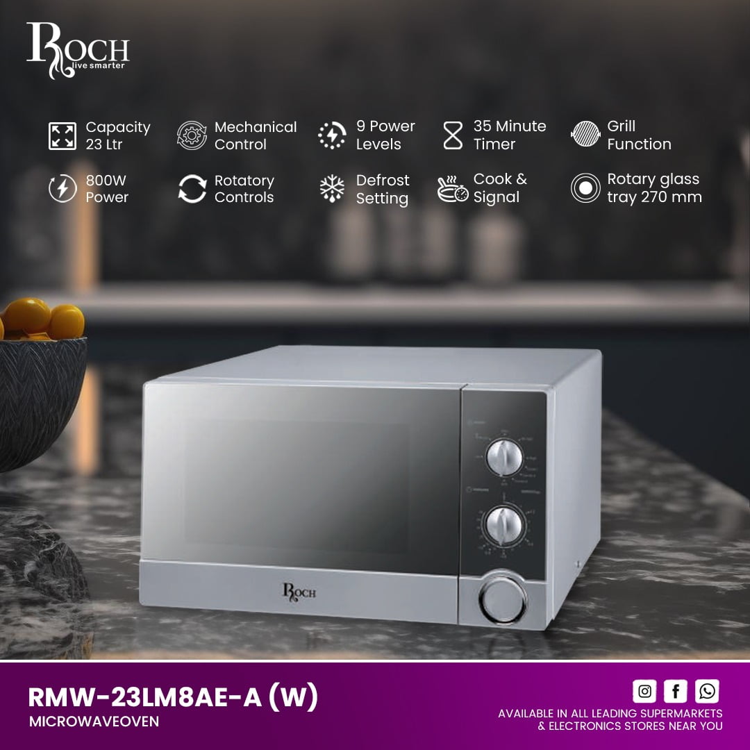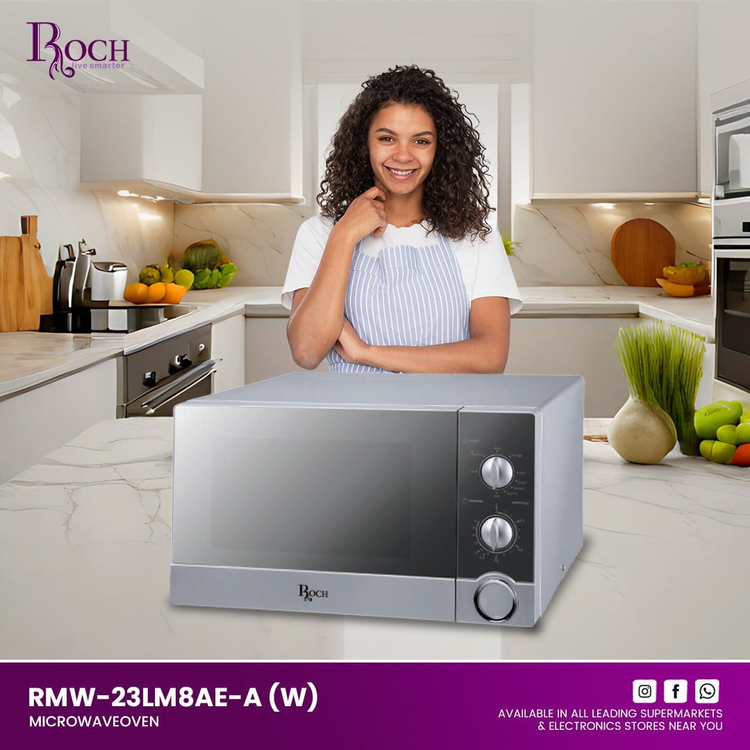 Introducing the ROCH Microwave Oven, Model RMW-23LM8AE-A (W), designed to simplify your cooking experience with its advanced features and user-friendly design. With a spacious 23-liter capacity, this microwave is perfect for families and individuals alike. Controlled via easy-to-use rotary controls, the ... ROCH Microwave Oven offers versatility with 9 power levels, allowing precise cooking tailored to your needs. Whether you’re defrosting frozen ingredients or preparing a quick meal, the 800W microwave power ensures efficient cooking results every time. Equipped with a grill function, this microwave adds a crispy touch to your dishes, expanding your culinary possibilities. A convenient 35-minute timer with a cook end signal alerts you when your food is ready, so you can multitask without worry. For added convenience, the microwave includes a rotary glass tray measuring 270 mm, ensuring even cooking and easy cleaning. Whether you’re a novice in the kitchen or a seasoned chef, the ROCH Microwave Oven combines reliability with performance, making it an essential appliance in any modern home. Discover a new level of cooking convenience with ROCH.Read more
