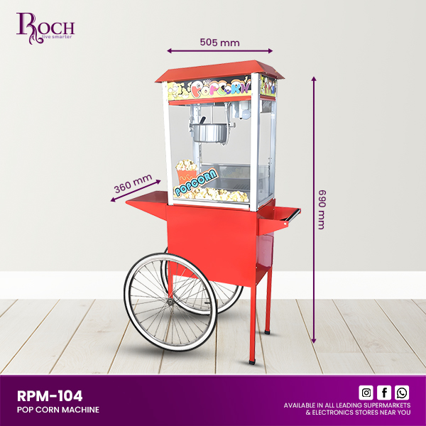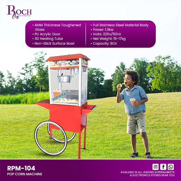 Enjoy freshly popped popcorn with the ROCH Pop Corn Machine (Model RPM-104). Designed for convenience and durability, this popcorn maker is perfect for both home and small-scale commercial use. Crafted from sturdy stainless steel, the RPM-104 features a robust construction that ... ensures long-lasting performance. The 4mm thick toughened glass and PU acrylic door provide safety and visibility while popcorn is being popped. The non-stick surface bowl makes cleanup effortless, saving you time after every use. Equipped with advanced 3D heating tubes, the RPM-104 ensures even heating throughout, resulting in perfectly popped popcorn every time. With a power rating of 1.3kw and operating at 220v/50Hz, it efficiently pops up to 80 ounces of popcorn per batch. Whether you’re hosting a movie night at home or setting up a concession stand, this machine delivers delicious popcorn with ease. Compact yet powerful, the RPM-104 weighs between 15-17kg and comes in a cart packaging size of 600520600mm, making it easy to transport and store. Elevate your popcorn experience with the ROCH Pop Corn Machine and enjoy the aroma of freshly popped corn in minutes.Read more
