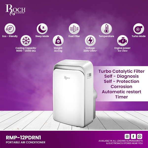 Experience ultimate comfort with the ROCH Portable Air Conditioner (RMP-12PDRN1). This powerful unit offers a cooling capacity of 9000 to 12000 BTU, ensuring your space stays cool and comfortable, even on the hottest days. Designed with convenience in mind, this air ... conditioner uses eco-friendly R-410a refrigerant and operates on a voltage of 220v-240v. Its compact dimensions of 466 x 397 x 765 mm and a weight of just 32.5 kg make it easy to move and position in any room. Equipped with advanced features, the ROCH Portable Air Conditioner includes a turbo catalytic filter and turbo mode for quick cooling, sleep mode for quiet operation during the night, and a dust filter to improve air quality. The self-diagnosis and self-protection functions ensure reliable and safe performance, while the corrosion-resistant materials enhance durability. This unit also includes an automatic restart function and a timer, allowing you to set your desired cooling schedule. With its eco-friendly design and efficient engine power options of 1CV and 1.5CV, the ROCH Portable Air Conditioner is a smart and sustainable choice for your cooling needs. Enjoy a cool, comfortable environment effortlessly with ROCHRead more