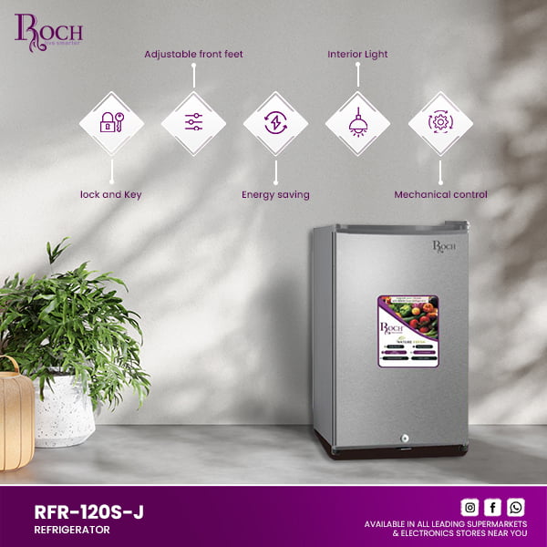 Meet the ROCH 102L Refrigerator (Model – RFR-120S-J), a perfect blend of efficiency and convenience for modern living. This refrigerator features easy-to-use mechanical controls for precise temperature management. Illuminate your groceries with the interior LED light, ensuring clear visibility at ... any time. Enjoy energy-saving operation with minimal noise, enhancing your kitchen experience. Adjustable front feet provide stability on uneven surfaces, while the lock & key feature offers added security for your stored items. Its compact dimensions (450mm W x 490mm D x 831mm H) make it ideal for smaller spaces without compromising on capacity. Whether for a compact apartment, office pantry, or kitchen upgrade, the ROCH 102L Refrigerator combines functionality with sleek design. Experience reliable cooling performance and stylish convenience with ROCH, designed to complement modern lifestyles. Efficient, reliable, and stylish, the ROCH 102L Refrigerator is perfect for homes and offices, delivering freshness and accessibility in a compact form factor.Read more