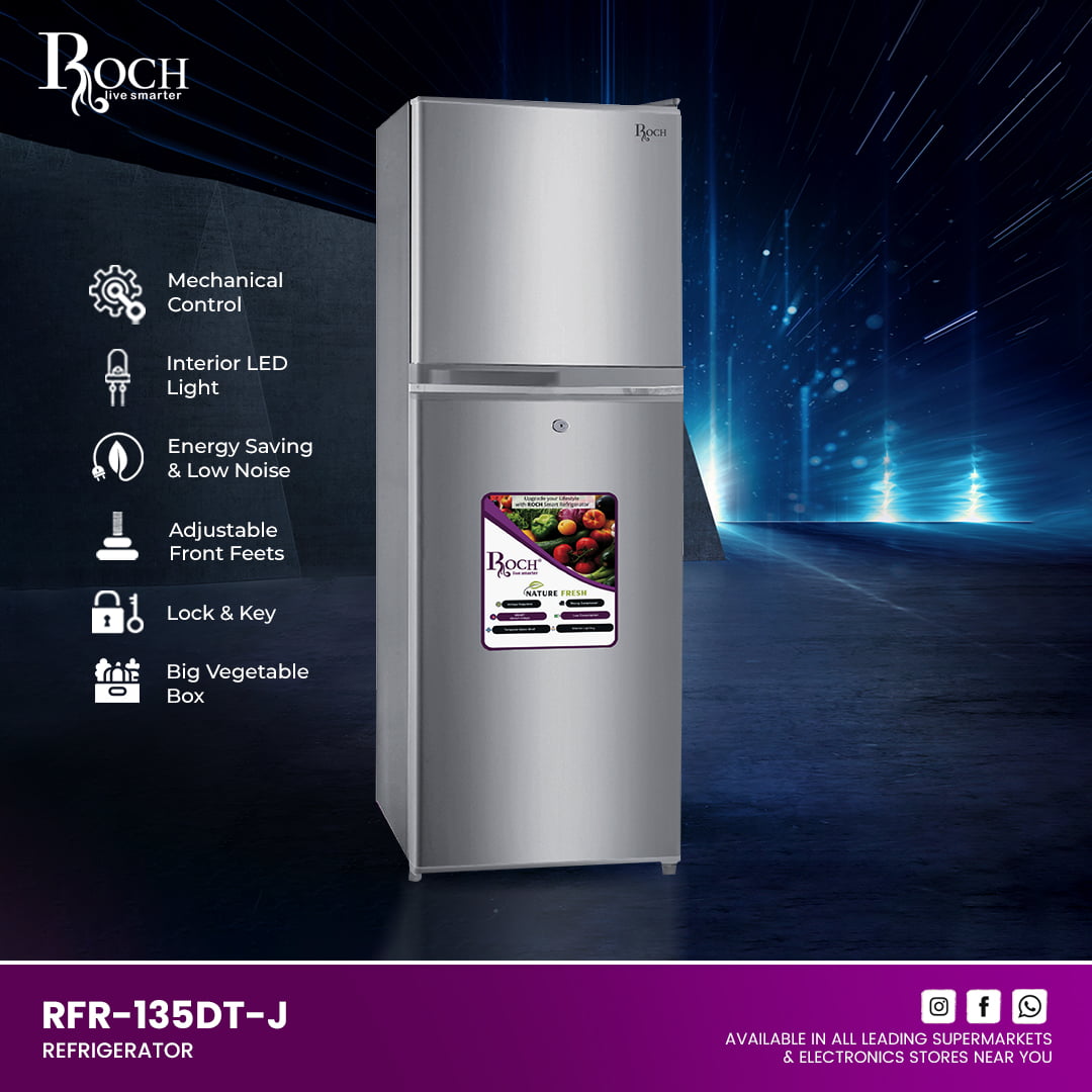 Experience efficient cooling and modern convenience with the ROCH Refrigerators 110L (Model RFR-135DT-J). This compact yet spacious refrigerator is designed to complement smaller living spaces while offering robust performance and user-friendly features. Efficient Cooling and Quiet Operation With mechanical controls and ... energy-saving technology, the RFR-135DT-J ensures precise temperature control and minimal energy consumption. Its low-noise operation enhances kitchen tranquility, making it ideal for homes where noise sensitivity is a concern. Convenient Storage and Security The interior LED light illuminates contents for easy visibility, while adjustable front feet provide stability on any surface. A lock&key feature adds security, safeguarding your perishables and essentials. Practical Design Boasting a generous 110-liter capacity and dimensions of 4504921135 mm, this refrigerator includes a spacious vegetable box for organized storage of fresh produce. Its sleek design and compact size make it a versatile choice for apartments, dormitories, or as an additional fridge in larger households. Upgrade your kitchen with the ROCH Refrigerators 110L (RFR-135DT-J) for reliable performance, ample storage, and user-friendly features that simplify daily life. Ideal for those seeking efficiency without compromising on style or functionality.Read more