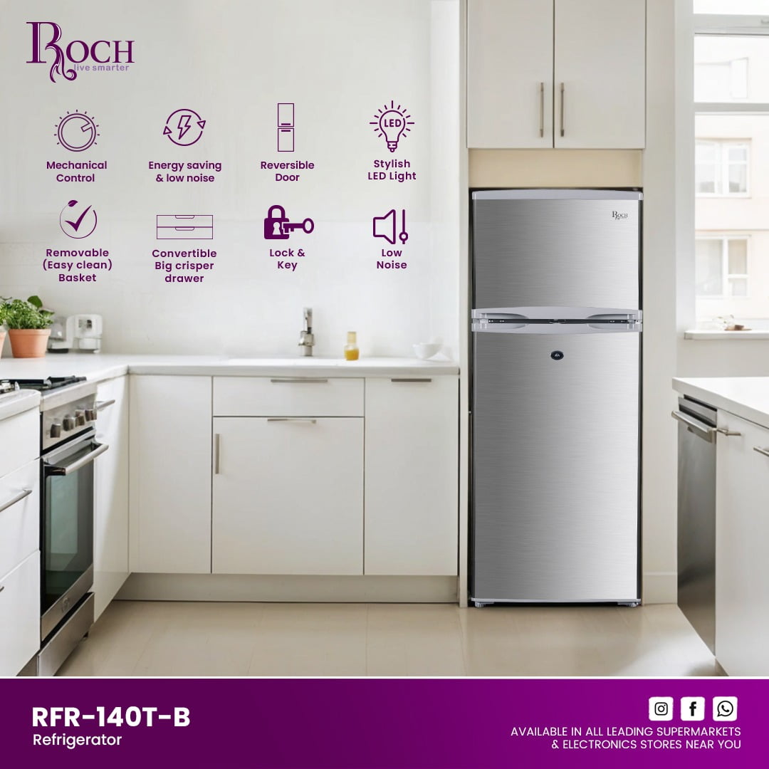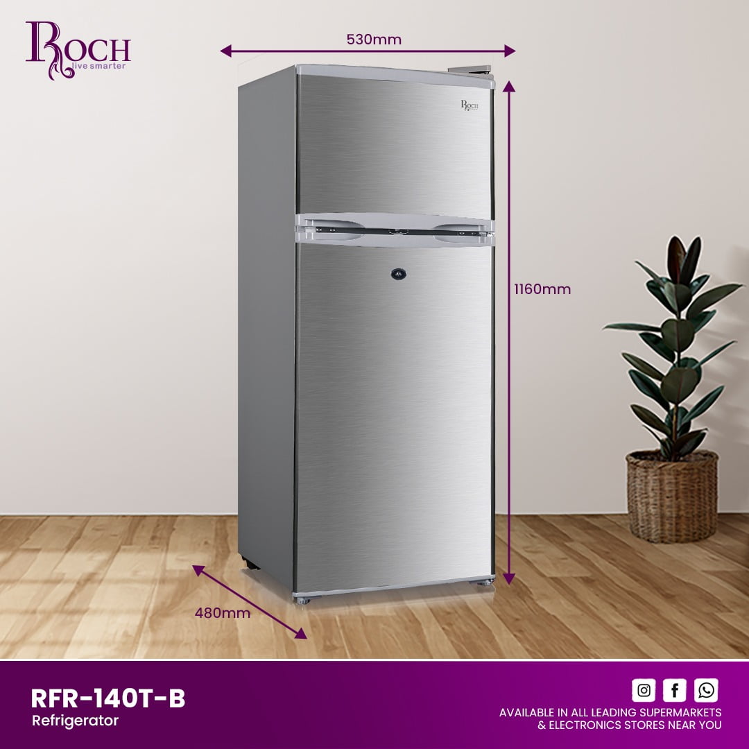 Discover the efficiency and style of the ROCH Refrigerators, model RFR-140T-B, designed to elevate your kitchen experience. With a sleek design and a capacity of 118 liters, this refrigerator is perfect for apartments, dorm rooms, or as an additional storage ... solution in any home. Equipped with mechanical controls, the ROCH Refrigerator offers simplicity and reliability in temperature management. It operates quietly, ensuring minimal disturbance in your living space while saving energy—a perfect blend of performance and environmental consciousness. Illuminate your refrigerator with the stylish LED light, which not only adds a modern touch but also helps you find items easily, day or night. The reversible door feature allows you to customize the refrigerator’s layout to fit your space and needs, enhancing flexibility in placement. Security is paramount with the ROCH Refrigerator, featuring a lock and key mechanism to keep your contents secure. Cleaning is made effortless with the removable gasket, designed for easy maintenance and hygiene. Adjust the front feet to ensure stability on any surface and optimize the refrigerator’s positioning. Enhance food preservation with the spacious big crisper drawer, keeping your fruits and vegetables fresh and crisp. Compact yet efficient, the ROCH Refrigerator is your reliable companion for storing essentials conveniently within reach. Experience convenience, style, and functionality with the ROCH Refrigerators—perfect for modern living spaces where efficiency meets elegance.Read more