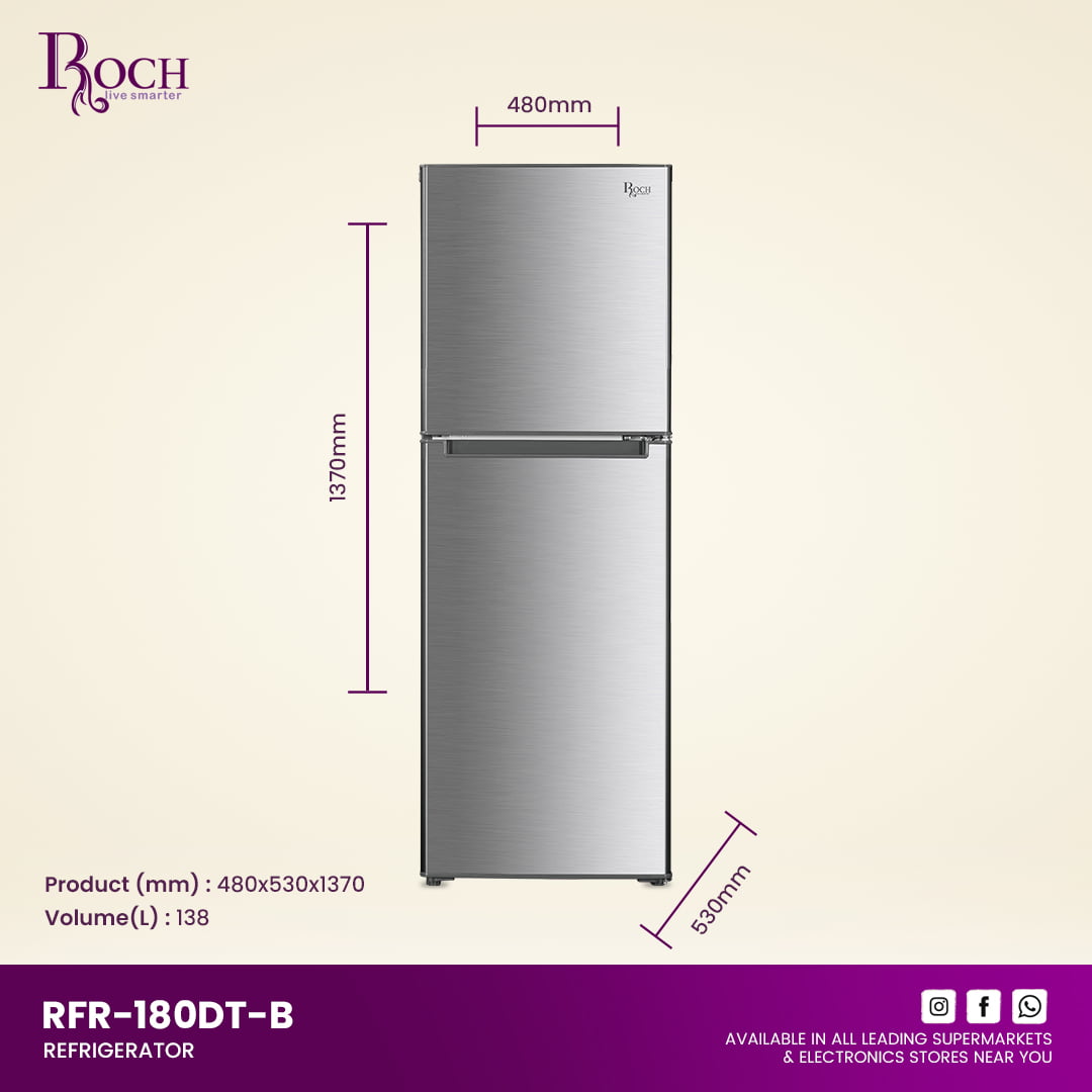 Introducing the Roch Refrigerator, a compact and efficient solution for your cooling needs. With a sleek design and dimensions of 480x530x1370 mm, this refrigerator is perfect for small kitchens, apartments, or office spaces. Its 138-liter capacity offers ample storage for ... your essentials while maintaining a compact footprint. The Roch Refrigerator features mechanical control, allowing you to easily adjust the temperature to suit your needs. It operates with energy-saving technology, ensuring low noise levels and efficient performance, making it an eco-friendly choice for your home. The stylish bulb light illuminates the interior, making it easy to locate your items, even in low light conditions. One of the standout features is the big crisper drawer, providing plenty of space for your fresh fruits and vegetables, keeping them crisp and fresh for longer periods. The removable gasket makes cleaning a breeze, ensuring your refrigerator stays hygienic and odor-free. The reversible door offers flexibility in installation, allowing you to open the door from either side to fit your kitchen layout. Additionally, the adjustable front feet ensure stability on any surface, allowing you to customize the height to fit your space perfectly. With its user-friendly features and efficient design, the Roch Refrigerator is an excellent choice for those seeking a reliable and stylish cooling solution. Experience the convenience and efficiency of the Roch Refrigerator, designed to meet your everyday cooling needs with ease. Upgrade your kitchen with this compact, energy-saving, and low-noise refrigerator and enjoy fresh food storage in style.Read more