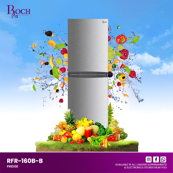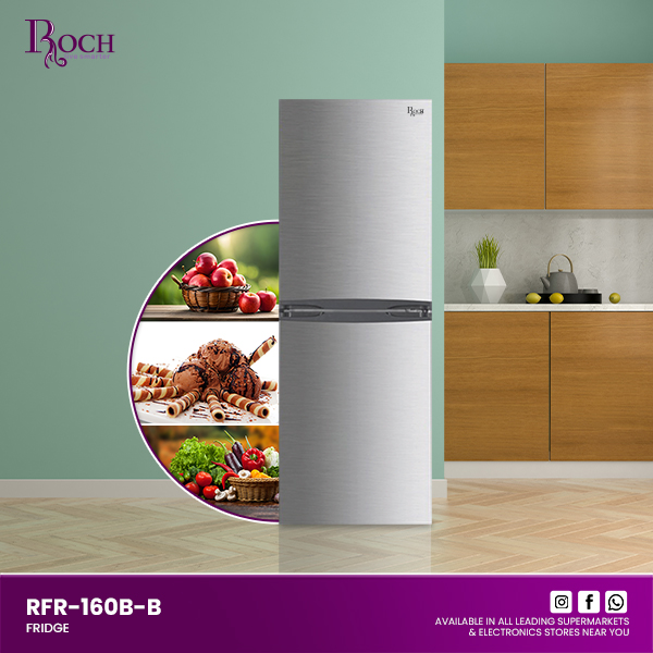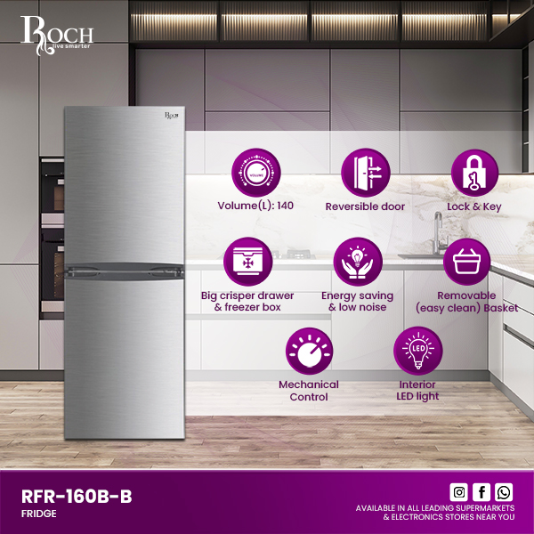 The ROCH Refrigerator Model RFR-160B-B is designed to meet all your cooling needs with efficiency and style. This refrigerator features mechanical controls that allow you to easily adjust the temperature to your preference. Its energy-saving technology ensures that you can ... enjoy lower electricity bills without compromising on performance. Additionally, the low noise operation means it runs quietly, making it perfect for any home environment. One of the standout features of this refrigerator is its stylish LED light, which not only adds a modern touch to your kitchen but also provides excellent visibility inside the fridge. The reversible door design offers flexibility in installation, allowing you to open the door from either side to suit your kitchen layout. The removable gasket makes cleaning a breeze, ensuring that maintaining your refrigerator is hassle-free. The ROCH Refrigerator also comes with adjustable front feet, making it easy to level the unit on any surface. Inside, you’ll find a spacious crisper drawer and a large freezer box, providing ample storage for all your fresh and frozen foods. With dimensions of 48x53x144 mm and a volume of 140 liters, this refrigerator is compact yet roomy enough to store all your essentials. Choose the ROCH Refrigerator Model RFR-160B-B for a perfect blend of functionality, efficiency, and modern design.Read more
