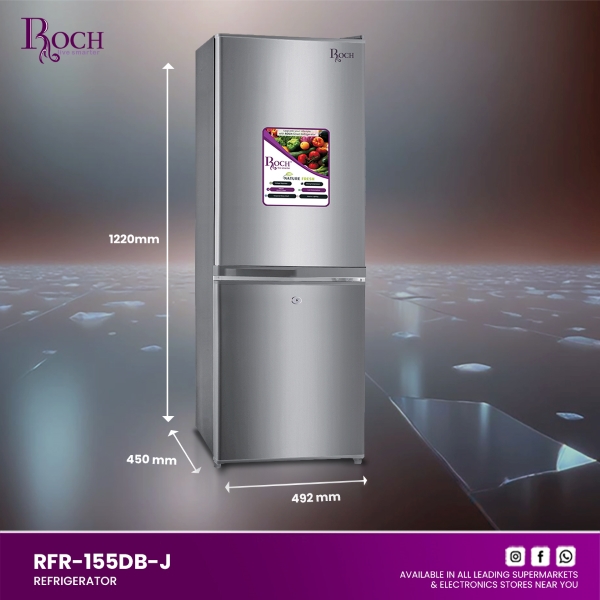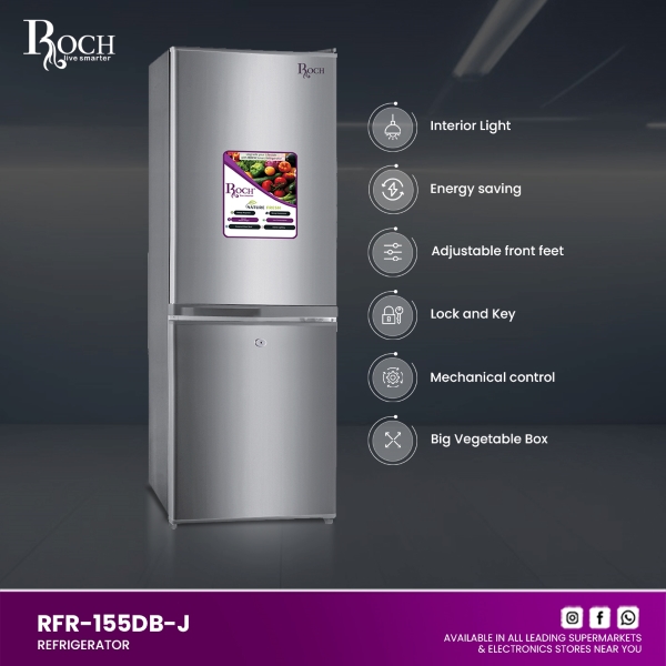 Upgrade your kitchen with the ROCH Refrigerators 142L (Model – RFR-155DB-J), combining functionality with modern design. This refrigerator features easy-to-use mechanical controls, ensuring effortless temperature management. Its interior LED light illuminates every corner, making it easy to find items day ... or night. Designed for efficiency, this model operates quietly while saving energy, keeping your kitchen serene and your electricity bills low. The adjustable front feet ensure stability on any surface, while the lock and key provide added security for your stored goods. For fresh produce, the refrigerator includes a spacious vegetable box, perfect for storing fruits and vegetables at optimal humidity levels. With dimensions of 4504921220 mm and a generous 142-liter capacity, it offers ample space for all your food storage needs without taking up too much floor space. Whether you’re upgrading your current kitchen setup or outfitting a new space, the ROCH Refrigerators 142L is the ideal choice for households looking for reliability, efficiency, and style. Discover the convenience of organized food storage with ROCH’s commitment to quality and innovation.Read more