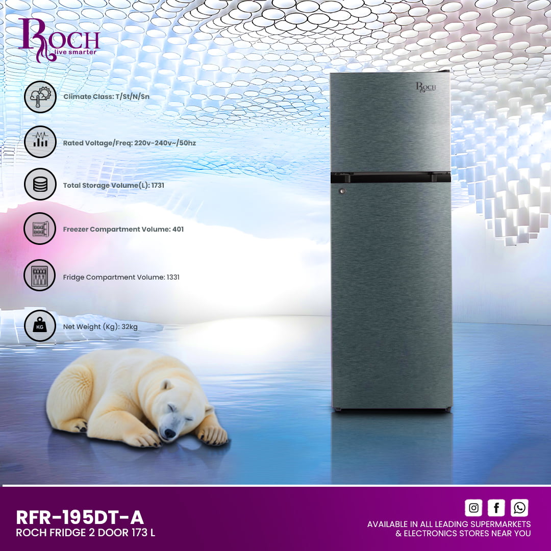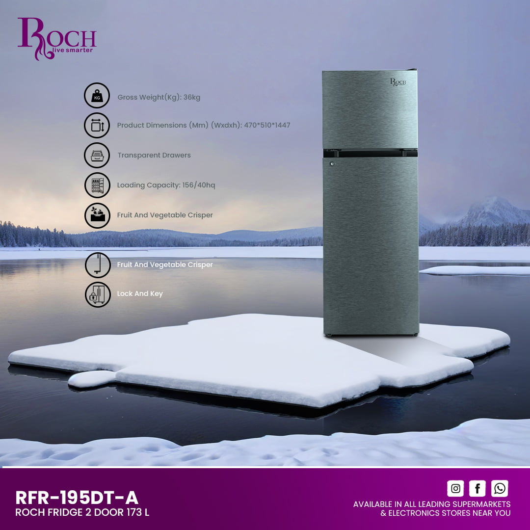 Upgrade your kitchen with the ROCH 2 Door Fridge, designed to blend efficiency with modern convenience. With a generous total storage volume of 173 liters, it provides ample space to store your groceries and essentials. The freezer compartment offers 40 ... liters of space, ideal for freezing your favorite foods, while the fridge compartment provides 133 liters for fresh produce and beverages. Equipped with transparent drawers and a fruit and vegetable crisper, organizing and accessing your food items is effortless. The adjustable legs ensure stability on any surface, while the lock and key feature provides added security for valuable items. This fridge operates efficiently with a rated voltage of 220-240V and a frequency of 50Hz, suitable for various climates (T/St/N/Sn). It weighs 32kg (net) and 36kg (gross), with dimensions of 470mm width, 510mm depth, and 1447mm height. Its loading capacity of 156 units per 40-foot HQ container makes it perfect for both residential and commercial use. Discover the perfect blend of functionality and style with the ROCH 2 Door Fridge, designed to meet your everyday cooling needs with ease and reliability. Ideal for households seeking quality and performance, this fridge ensures your food stays fresh and accessible at all times.Read more