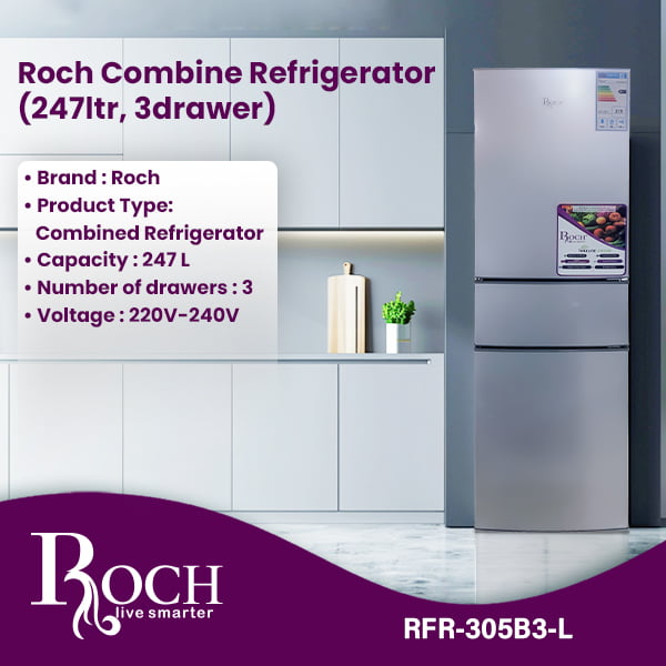 Discover the Roch Combination Refrigerator (247 Liters, 3 Drawers), a versatile and efficient cooling solution designed to meet your various storage needs. Made by Roch, this combination refrigerator offers the perfect balance of functionality and convenience to enhance your kitchen ... experience. With a generous 247 liter capacity and three large drawers, this refrigerator offers ample space to store all your products groceries, drinks and fresh produce with ease. The three-drawer design ensures efficient organization, allowing you to separate and access different types of foods effortlessly, making meal preparation easier. Operating within a voltage range of 220V-240V, this refrigerator is compatible with standard electrical outlets, ensuring hassle-free installation in any kitchen or living space. Whether you’re a bustling family or living independently, this refrigerator is designed to meet your cooling needs with reliability and convenience. Rely on the included 12-month warranty, giving you peace of mind spirit and assurance of the quality and performance of your investment. Roch is committed to providing appliances that stand the test of time, ensuring durability and satisfaction for your home. Whether you’re stocking up for the week ahead or preparing for gatherings with friends and family, the Roch Combined refrigerator (247 Liters, 3 Drawers) offers the versatility and storage capacity you need. Say goodbye to food waste and embrace the convenience of organized freshness with this stylish and practical refrigerator from Roch. Reliable cooling technology at your fingertips. With its spacious capacity, three-drawer design and user-friendly features, it’s the perfect addition to any home, ensuring your food stays fresh and accessible at all times.Read more