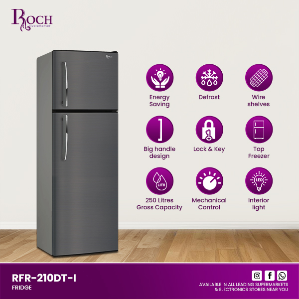 Introducing the ROCH FRIDGE 250L (RFR-210DT-I), designed to meet all your refrigeration needs with simplicity and efficiency. With a gross capacity of 210 liters, this fridge offers ample space to store your groceries, beverages, and more. The top freezer design ... provides easy access to frozen items, while the defrost feature ensures hassle-free maintenance. The ROCH FRIDGE is equipped with a big handle design, making it easy to open and close the door, even when your hands are full. The interior light illuminates the contents, so you can quickly find what you need, day or night. The mechanical control allows for easy temperature adjustments, ensuring your food stays fresh for longer. For added security, this model includes a lock and key feature, perfect for keeping your items safe. The wire shelves are sturdy and provide versatile storage options for all your food items. Plus, the energy-saving design helps you reduce your electricity bills without compromising on performance. Choose the ROCH FRIDGE 250L (RFR-210DT-I) for a reliable and user-friendly refrigeration solution. Whether you are stocking up for the week or just need a place to keep your essentials, this fridge is built to make your life easier. Experience the convenience and efficiency of ROCH today.Read more