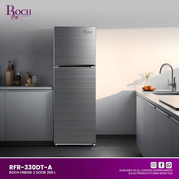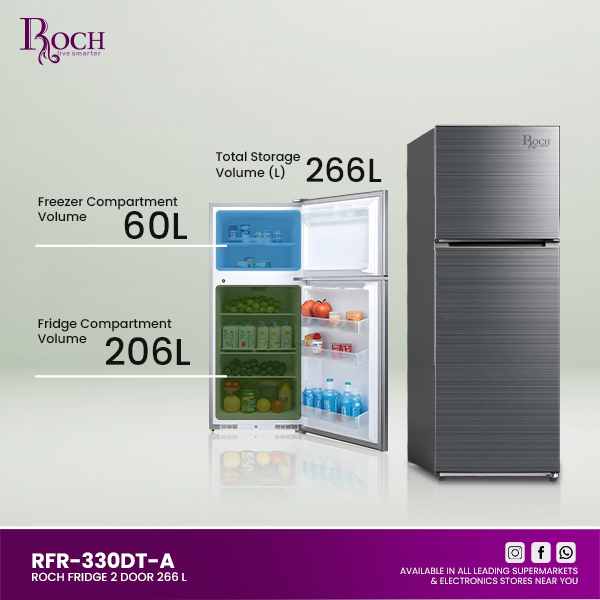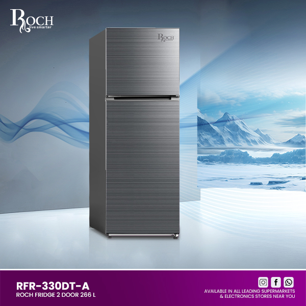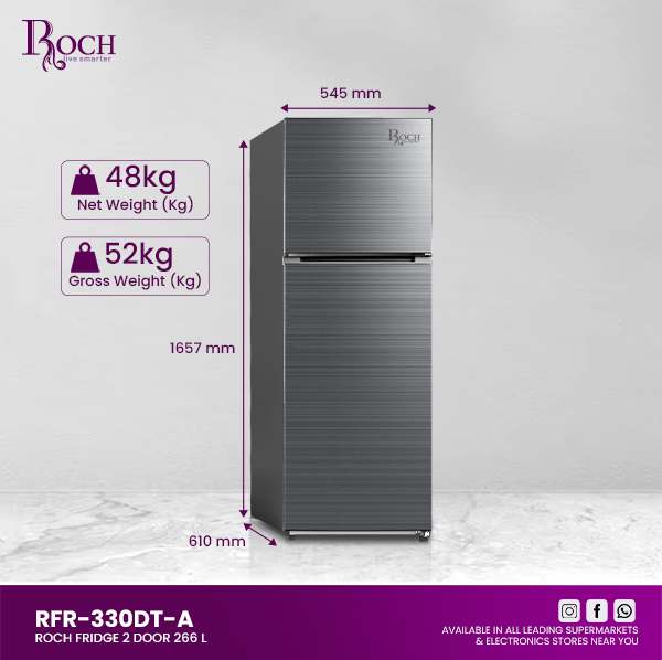 Discover the perfect blend of style and functionality with the ROCH FRIDGE 2 DOOR 266 L (RFR-330DT-A). Designed for modern living, this refrigerator offers ample storage space with a total volume of 266 liters, split into a generous 60 liters ... for the freezer and 206 liters for the fridge compartment. Equipped with a sleek design and user-friendly features, this fridge includes transparent drawers for easy access to your food, glass shelves for a clean look, and a big fruit and vegetable crisper to keep your produce fresh. The advanced No Frost technology ensures that you never have to worry about ice build-up, saving you time and effort. With its energy-efficient LED light, finding items in the fridge is effortless. The ROCH FRIDGE 2 DOOR 266 L (RFR-330DT-A) operates efficiently at a rated voltage of 220v-240v~/50hz and is designed to fit seamlessly into your kitchen with dimensions of 545mm width, 610mm depth, and 1657mm height. Ideal for families and individuals alike, this fridge offers convenience, durability, and style, making it a great addition to any home.Read more