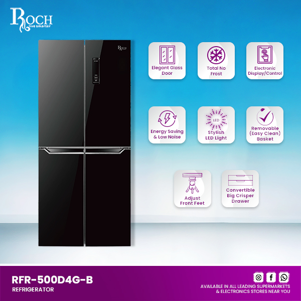 Introducing the ROCH Refrigerators 401L (Model: RFR-500D4G-B), a blend of style and functionality perfect for any modern kitchen. The elegant glass door adds a touch of sophistication, making this refrigerator a stunning addition to your home. Designed for efficiency, this refrigerator ... features a total no frost system, eliminating the need for manual defrosting. The electronic display and control panel offer convenient settings, including eco, holiday, and super freezing functions, allowing you to tailor the refrigerator’s performance to your needs. Energy-saving and low noise, the ROCH Refrigerator ensures a peaceful and cost-effective operation. The stylish LED light illuminates the interior, making it easy to find what you need. The removable gasket makes cleaning a breeze, ensuring your refrigerator stays fresh and hygienic. For added convenience, the adjustable front feet allow you to level the refrigerator to suit your space. The convertible crisper drawer can switch between a fresh zone and a crisper drawer, providing flexible storage options for your fruits and vegetables. Measuring 790mm x 700mm x 1800mm, this spacious 401L refrigerator offers ample storage for all your groceries. Experience the perfect combination of style, efficiency, and convenience with the ROCH Refrigerators 401L (RFR-500D4G-B).Read more
