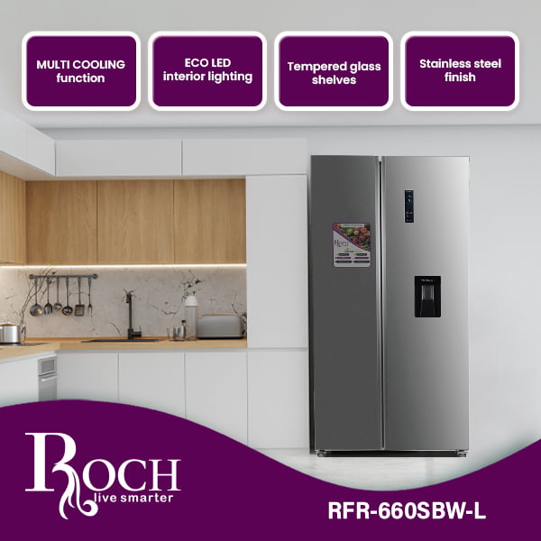 Optimize your kitchen with the Roch Side-by-Side Refrigerator (518 liters, Multi Cooling – ACS Technology) in stainless steel, an elegant and efficient appliance designed to meet all your refrigeration needs. Manufactured by Roch, this refrigerator combines spacious capacity with advanced ... features to enhance your food storage experience. Featuring a total capacity of 518 liters, comprising 332 liters for the refrigerator and 186 liters for the freezer, This refrigerator provides generous space for storing a wide variety of groceries, frozen foods, and fresh produce. With four drawers and two doors, organizing your food has never been easier, ensuring easy access and efficient use of space. Equipped with innovative features such as NoFrost and Multi Cooling technology , this refrigerator provides even cooling throughout, preventing ice buildup and keeping your food fresh for longer periods of time. Say goodbye to the chore of manual defrosting and hello to hassle-free maintenance and optimal food preservation. The A+ energy rating ensures efficient energy consumption, while the water fountain adds convenience to your kitchen, providing easy access to refreshing water whenever you need it. Interior ECO LED lighting illuminates the refrigerator’s contents, making it easy to find what you need, while tempered glass shelves provide durability and support for your food. Featuring a sleek stainless steel finish , this refrigerator adds a touch of sophistication to your kitchen decor. Operating at a voltage of 220V-240V, it is compatible with standard electrical outlets, ensuring easy installation in any kitchen or living space. Plus, with a 12-month warranty included, you can buy with confidence, knowing your investment is protected. Enhance your kitchen with the Roch Side-by-Side Refrigerator (518 liters, Multi Cooling – ACS Technology) in stainless steel and enjoy the convenience of spacious storage and advanced cooling technology. Say hello to organized freshness and goodbye to food waste with this stylish and practical refrigerator from Roch.Read more