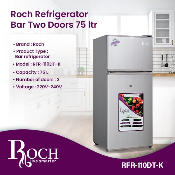 Discover the Roch 75 Liter Double Door Refrigerator, a spacious and reliable refrigerator designed to enhance your cooling experience. Manufactured by Roch, this refrigerator combines functionality and modern design to perfectly complement any environment in which it is placed. Featuring the ... RFR-110DT-K, this bar refrigerator offers an impressive capacity of 75 liters, giving you thus enough space to store all your favorite drinks and snacks. The two-door configuration improves accessibility and organization, allowing you to store your items neatly for easy access. Working efficiently with a voltage of 220V-240V, this refrigerator is compatible with electrical outlets standard, ensuring hassle-free installation wherever you choose to place it. Whether in your kitchen, office, dorm room, or entertainment space, you can count on its consistent cooling performance to keep your drinks and snacks pleasantly cool. Worried about its longevity? Don’t worry, the Roch 75 Liter Double Door refrigerator comes with a full 12 month warranty, giving you peace of mind and assurance of its build quality. Roch prides itself on offering appliances that are not only functional, but also durable, ensuring your investment is protected. Ideal for compact spaces or as an additional storage solution for your drinks and snacks, this refrigerator is suited to the demands of modern lifestyles. Whether you’re hosting gatherings, stocking up for the week ahead, or simply need a convenient way to keep your drinks cold, the Roch 75 Liter Double Door Refrigerator is your go-to choice. n Improve your cooling installation with this elegant and efficient refrigerator from Roch. With its spacious capacity, versatile two-door design and reliable performance, it is the perfect addition to any home or business environment. Say goodbye to lukewarm drinks and welcome the convenience of cold refreshments at your fingertips.Read more