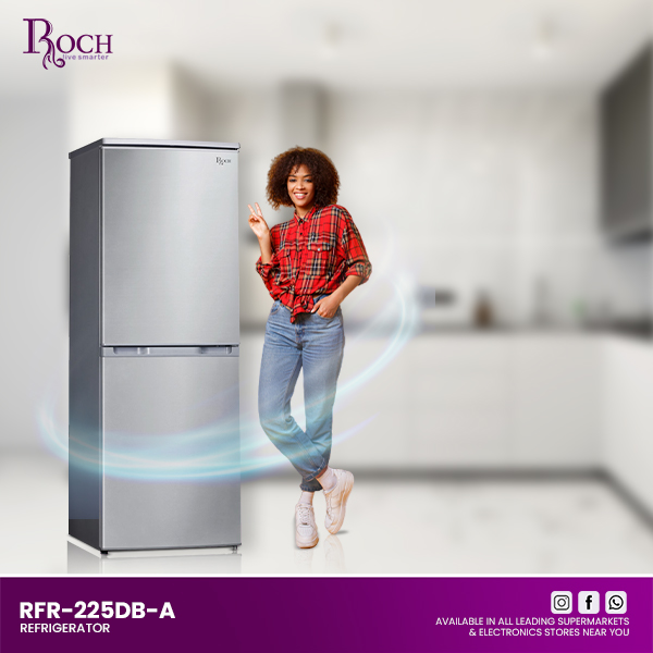 Upgrade your kitchen with the ROCH Fridge 2 Door Bottom Freezer, model RFR-225DB-A. This stylish and efficient fridge is designed to meet all your cooling needs with ease. With a total storage volume of 180 liters, it offers plenty of ... space to store all your fresh and frozen foods. The bottom freezer design is convenient, placing the freezer compartment at the bottom for easy access to frequently used items. The freezer has a volume of 66 liters, while the fridge compartment provides 114 liters of storage for your fresh produce and other refrigerated items. The transparent drawers make it simple to see and organize your frozen foods, while the fruit and vegetable crisper ensures your produce stays fresh longer. Built with a climate class of N/St o, this fridge operates efficiently within a temperature range suitable for most homes. Its adjustable legs allow for easy leveling on uneven surfaces, and the recessed handle adds a sleek, modern touch. With a net weight of 44 kg and compact dimensions of 500x540x1525 mm, this fridge fits comfortably in most kitchen spaces. For reliable performance and a practical design, the ROCH Fridge 2 Door Bottom Freezer is an excellent choice.Read more