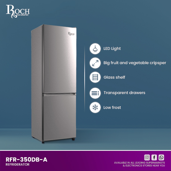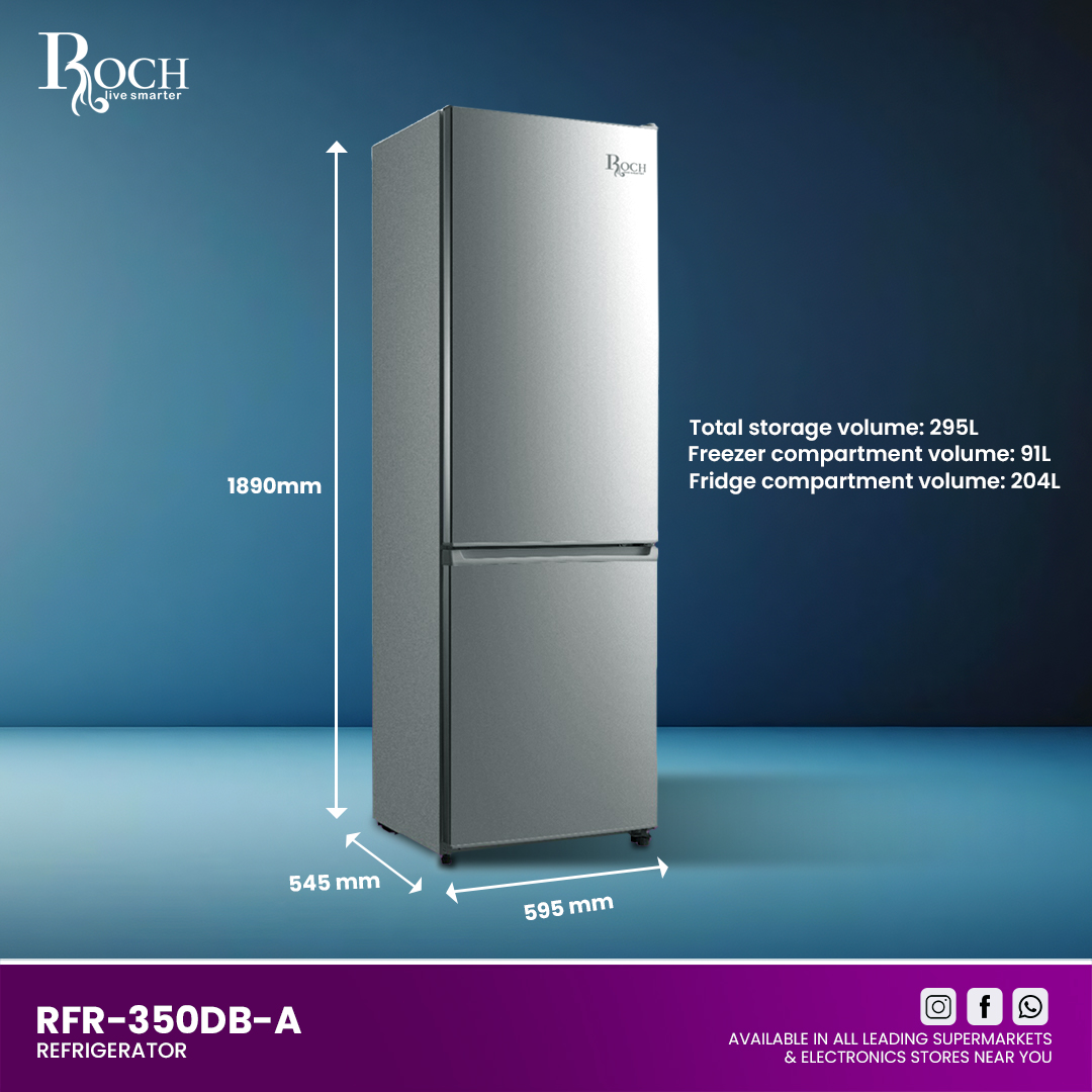 Upgrade your kitchen with the ROCH Fridge 2 Door Bottom Freezer (Model RFR-350DB-A), designed for both efficiency and style. This spacious fridge offers a total storage volume of 295 liters, divided between a generous 204 liters in the fridge compartment ... and 91 liters in the freezer compartment. The modern design features a sleek glass shelf and a large fruit and vegetable crisper, making it easy to organize and access your groceries. The fridge includes transparent drawers, so you can quickly find what you need without opening every compartment. Enjoy the convenience of low frost technology that minimizes ice build-up, ensuring your food stays fresh and your fridge stays clean. Equipped with LED lighting, this fridge provides bright and clear visibility, so you can easily locate items even in low light. With a climate class of N/St, it’s suitable for various environments, and its compact dimensions (595 mm x 545 mm x 1890 mm) make it a perfect fit for most kitchens. The ROCH Fridge is also designed for energy efficiency and ease of use, with a rated voltage of 220-240V and a frequency of 50Hz. Experience convenience and modern design with the ROCH Fridge 2 Door Bottom Freezer, a practical addition to any home.Read more