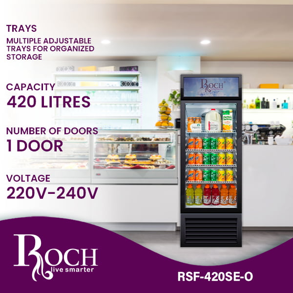 Discover the Roch Refrigerated Display Case ? your ultimate cooling companion, designed by Roch. This upright display refrigerator is meticulously designed to provide efficient and stylish storage of your food, whether for domestic use or in a commercial environment. With a ... spacious capacity of 420 liters, the Roch Refrigerated Display Case offers ample ‘space to fit all your groceries, drinks and snacks with ease. Its single-door design ensures convenient access to your items, while adjustable trays inside provide flexibility for personalized storage options, keeping everything neatly organized and easily accessible when you need them. nOperating seamlessly at a standard voltage of 220V-240V, this refrigerator is suitable for a wide range of domestic or commercial environments. Plus, with the added assurance of a comprehensive two-year warranty, you can confidently rely on its performance, knowing your investment is protected against unforeseen problems. Whether you run a busy household or a busy commercial space, the Roch Refrigerated Display Case is the ultimate solution for preserving the freshness and organization of your food. Its sleek, modern design, combined with practical features, makes it a versatile choice for storing a diverse range of items, from fresh produce to chilled drinks. Enhance your kitchen or commercial establishment with the Display Case Refrigerated Roch today and experience the unparalleled convenience of efficient and stylish food storage. With its user-friendly design and reliable performance, this refrigerator is destined to become an indispensable asset in your daily life. Invest in the Roch Refrigerated Display Case and enjoy the many benefits of organized and efficient food storage.Read more