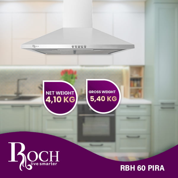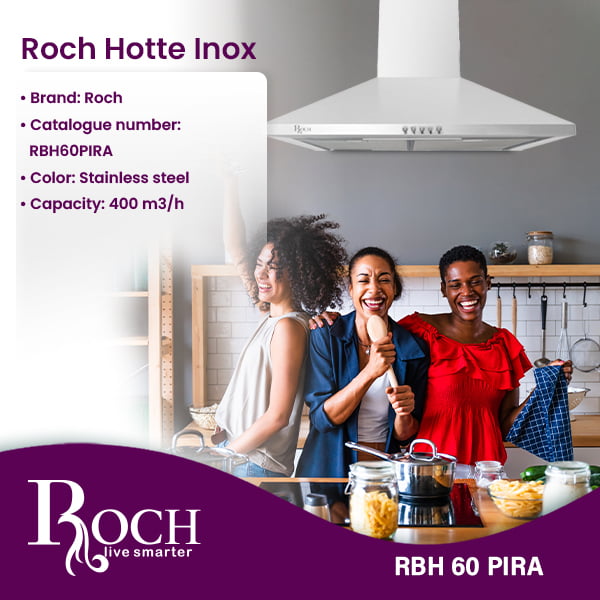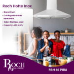 Enhance the functionality and aesthetics of your kitchen with the Roch Stainless Steel Hood. Designed by the prestigious Roch brand, the RBH60PIRA model combines sleek design and efficient performance to create an essential appliance for any modern kitchen. Made from high-quality ... stainless steel, this hood combines contemporary elegance, durability and longevity. Its timeless design fits perfectly into different kitchen styles, whether it is a minimalist or more traditional aesthetic. With dimensions of 60 x 60, this hood combines compactness and power. It is suitable for all sizes of kitchens, from comfortable apartments to spacious culinary spaces, ensuring efficient ventilation whatever the space constraints. Featuring a robust capacity of 400 m3/h, the Steel Hood Roch Stainless effectively eliminates fumes, steam and cooking odors, maintaining a fresh and welcoming atmosphere in your kitchen. Say goodbye to lingering odors and hello to a cleaner, more comfortable cooking environment. Despite its powerful performance, this hood remains lightweight, weighing just 4.10 kg (net weight) and 5.40 kg (weight raw), thus facilitating its installation. Its user-friendly features and simple design make installation hassle-free, allowing you to enjoy improved ventilation without any unnecessary delays. Investing in the Roch Stainless Steel Hood not only improves the functionality of your kitchen, but also your culinary experience. With its sleek appearance, reliable performance, and effortless installation, this hood will become an indispensable addition to your culinary space. Say goodbye to kitchen smells and enjoy a fresher, more pleasant cooking experience with the Roch Stainless Steel Hood.Read more