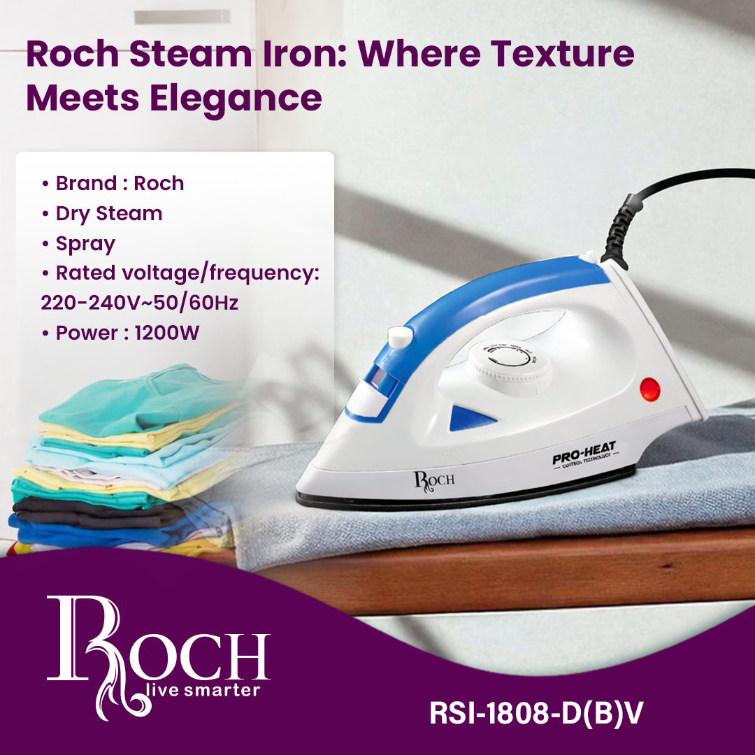 The ROCH STEAM IRON RSI-1808-D(B)V is designed to deliver perfect results with every use. It features a powerful 1200W motor for efficient performance and quick heating, making ironing a breeze. This steam iron comes with a dry steam function and ... a spray option to easily tackle even the most stubborn wrinkles on a variety of fabrics. Its ergonomic design ensures comfort and ease of use, while the 220-240V frequency makes it perfect for standard home usage. Whether you’re ironing clothes or linens, this iron provides the performance and reliability you need for flawless results.Read more