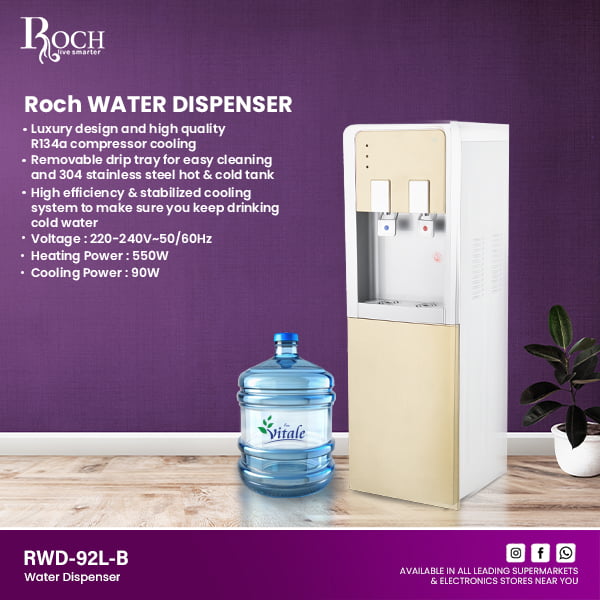 Discover the elegance and functionality of the Roch Water Dispenser, designed to enhance your hydration experience with style and reliability. Featuring a luxurious design and powered by a high-quality R134a compressor cooling system, this dispenser ensures your water remains refreshingly ... cold throughout the day, making it ideal for homes and offices alike. Enjoy the convenience of a removable drip tray that facilitates easy cleaning, maintaining cleanliness effortlessly. The hot and cold-water tanks are crafted from durable 304 stainless steel, ensuring purity and durability over time, providing you with peace of mind. With a high-efficiency cooling system, the Roch Water Dispenser guarantees stable and efficient cooling to keep your water cold and refreshing. Its 550W heating power delivers instant hot water for your favorite beverages, while the 90W cooling power ensures chilled water on demand. Operating at a standard voltage of 220-240V and 50/60Hz, this dispenser is designed for reliability and convenience in any setting. Whether you need a quick refreshment or a hot drink, the Roch Water Dispenser meets your needs with efficiency and elegance. Upgrade your hydration routine with the Roch Water Dispenser, where superior craftsmanship and user-friendly design converge to provide optimal drinking water temperatures at all times.Read more