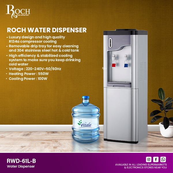 Experience luxury and convenience with the WATER DISPENSER (Model – RWD-61L-B). Designed with a high-quality finish, this water dispenser not only looks stylish but also ensures top performance. The advanced R134a compressor cooling system provides efficient and stabilized cooling, so ... you can always enjoy refreshing cold water. The RWD-61L-B features a removable drip tray, making it easy to clean and maintain. The hot and cold tanks are made from durable 304 stainless steel, ensuring longevity and hygiene. With a voltage range of 220-240V and operating at 50/60Hz, this dispenser is perfect for any home or office environment. For those who love a hot beverage, the dispenser offers a heating power of 550W, ensuring your drinks are prepared quickly. The cooling power of 100W guarantees that your water is chilled to perfection. This water dispenser combines efficiency and style, making it an essential appliance for your daily hydration needs. Upgrade your drinking experience with the WATER DISPENSER (RWD-61L-B) and enjoy the perfect blend of elegance and functionality.Read more